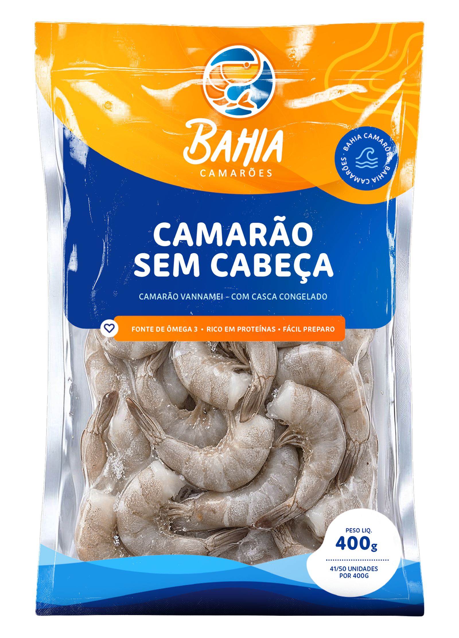 O camarão sem cabeça não passa pelo processo de evisceramento e continua com sua casca, sendo retirada apenas a cabeça do animal, está disponível em 4 tamanhos:51/60 (P), 41/50 (M), 31/40 (G) e 21/25 (XG)